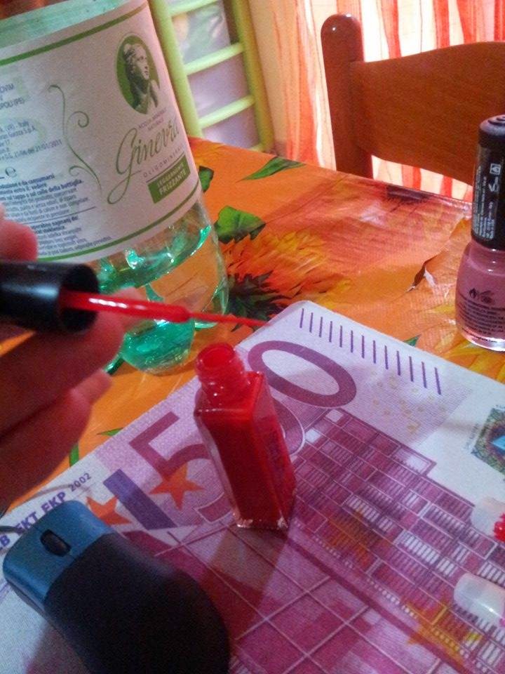 Colore acrilico rosso Clarissa nails numero 14 con pennelli super fino per le nostre decorazioni! nell immagine vi ho fatto vedere sia una passata che le linee fine che si possono fare per nail art...e sopra potrete vedere il pennellino come è fino